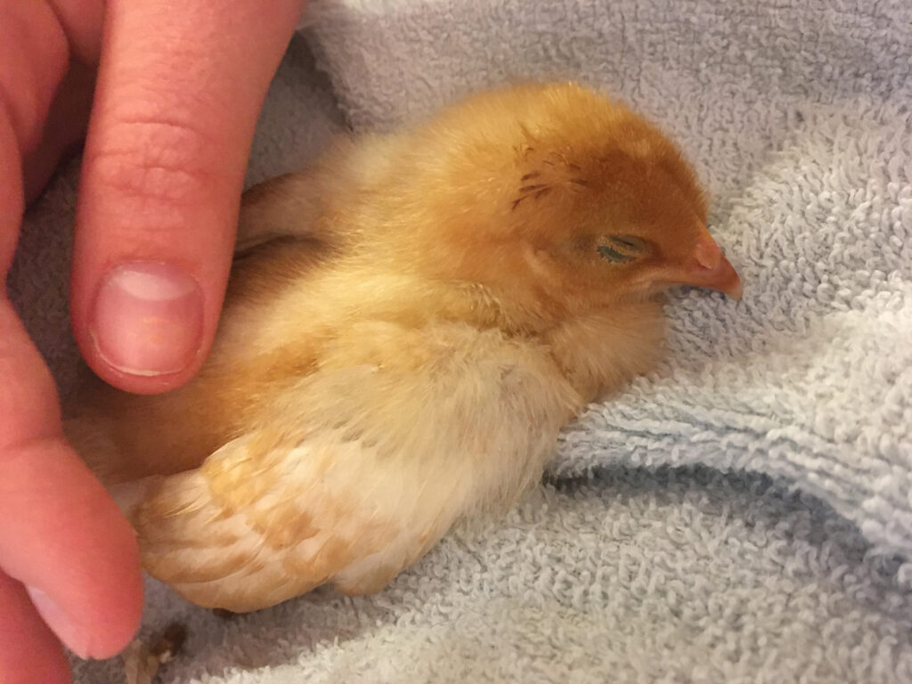 Here is Amber, falling asleep in my lap! She is the tiniest, and I can see a noticeable difference between her and her sisters’ height. This happened a little after I washed her off. I didn’t expect any of my babies to have pasty butt, but this little one had it… I am worried that I am not a good enough chicken “mommy”. She has had a different experience than any of my other chickies. After about 2 weeks of caring for her especially, she seems to be doing just fine!