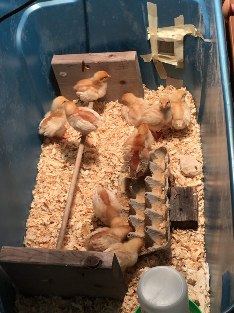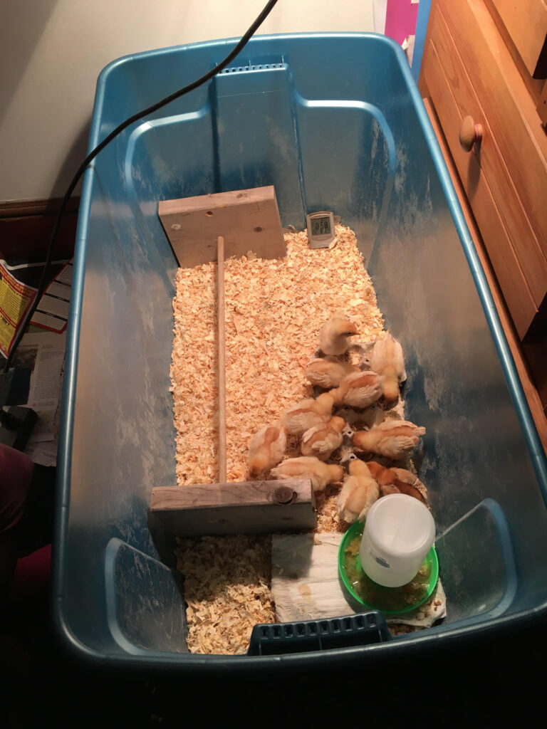 Mom and I moved their brooder into the upstairs bathroom. We didn’t bring their heater with them, so their temperature lowered slightly more than was comfortable. But after 20 minutes of them huddling like penguins, we got them back into their nice, cozy little room… that I used to occupy.